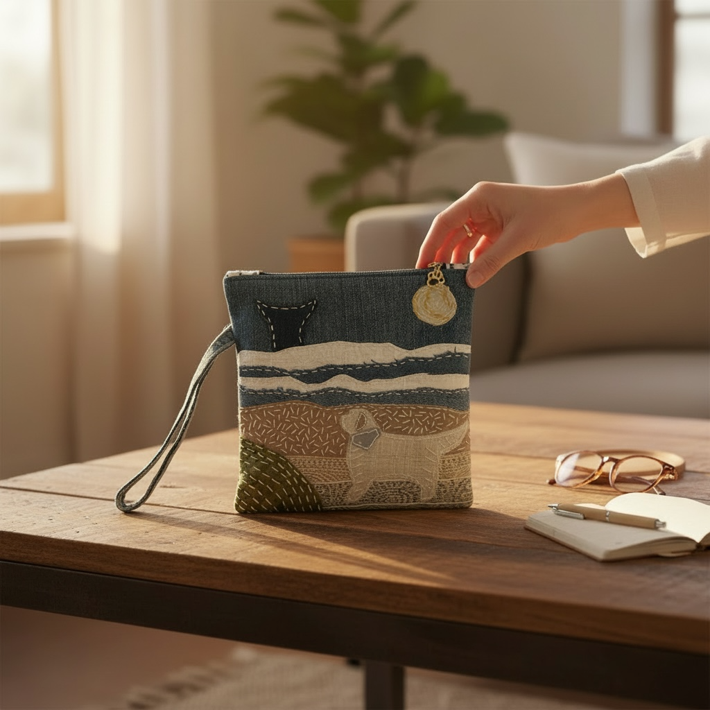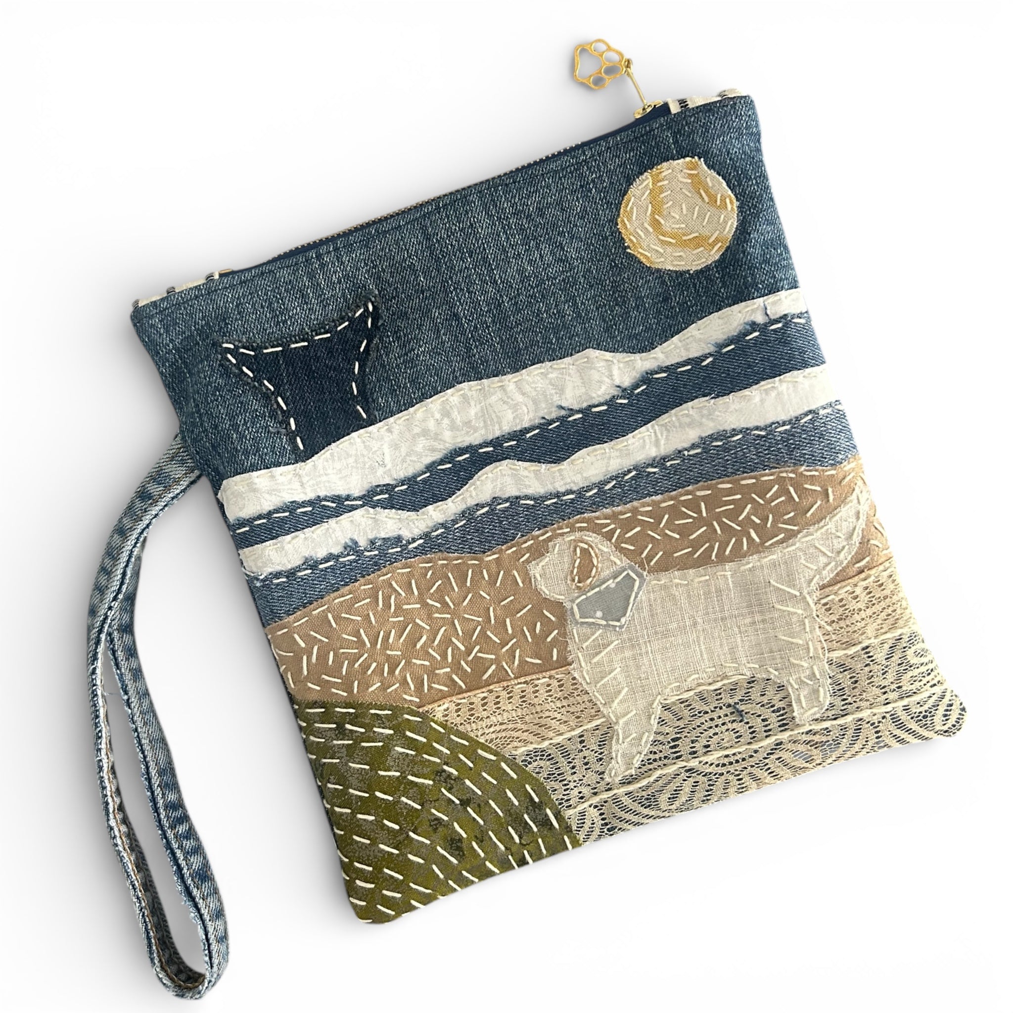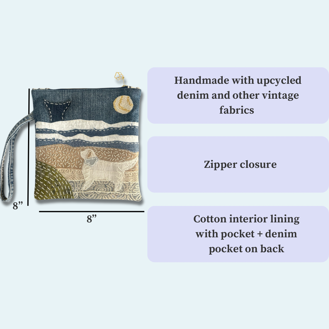 This one-of-a-kind zipper pouch features a golden retriever enjoying the beach, with layered textures that suggest rolling waves, open sky, and a distant whale just offshore. Each element is hand-stitched using upcycled denim, lace, and vintage fabrics, giving the piece depth, movement, and character.