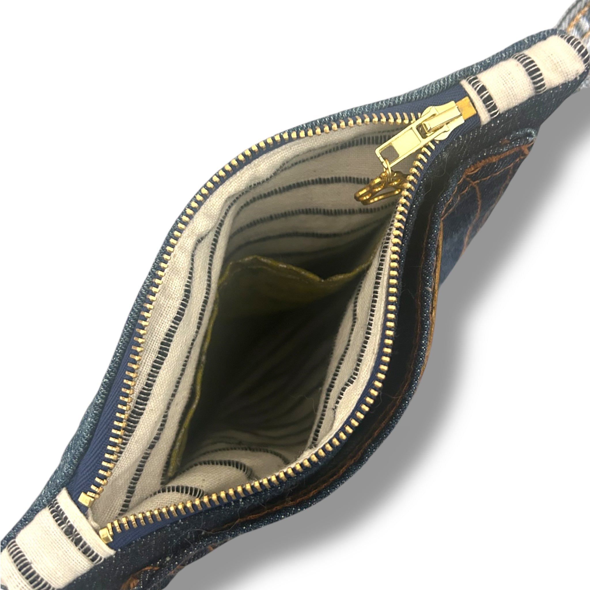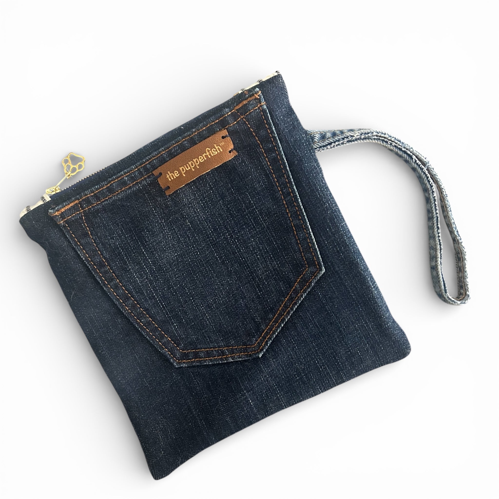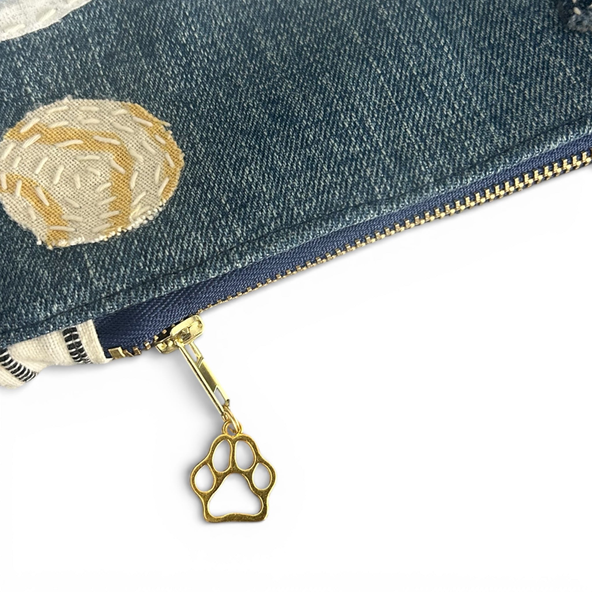 Finished with a gold-tone zipper, paw-print zipper pull, and denim wrist strap, this pouch balances beauty and function. The back showcases a repurposed denim pocket- a reminder that this piece once lived another life before becoming something new.
