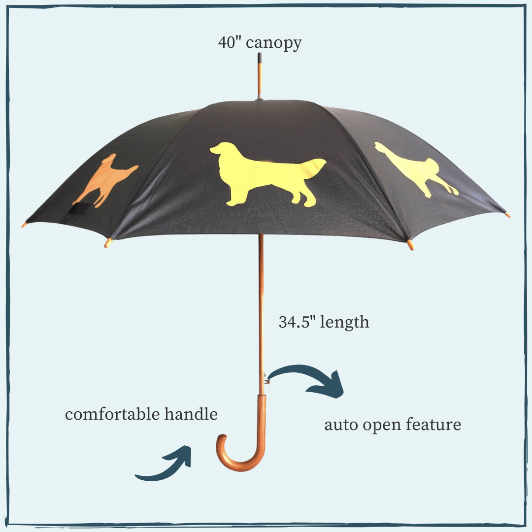 Turn even the gloomiest days into something brighter with this Golden Retriever Umbrella- a stylish, durable rain accessory designed for anyone who carries a soft spot for this lovable, loyal breed. Featuring bold Golden Retriever silhouettes and a classic black canopy, it’s the perfect way to show your Golden pride while staying dry and comfortable in any weather.