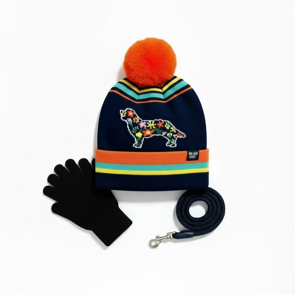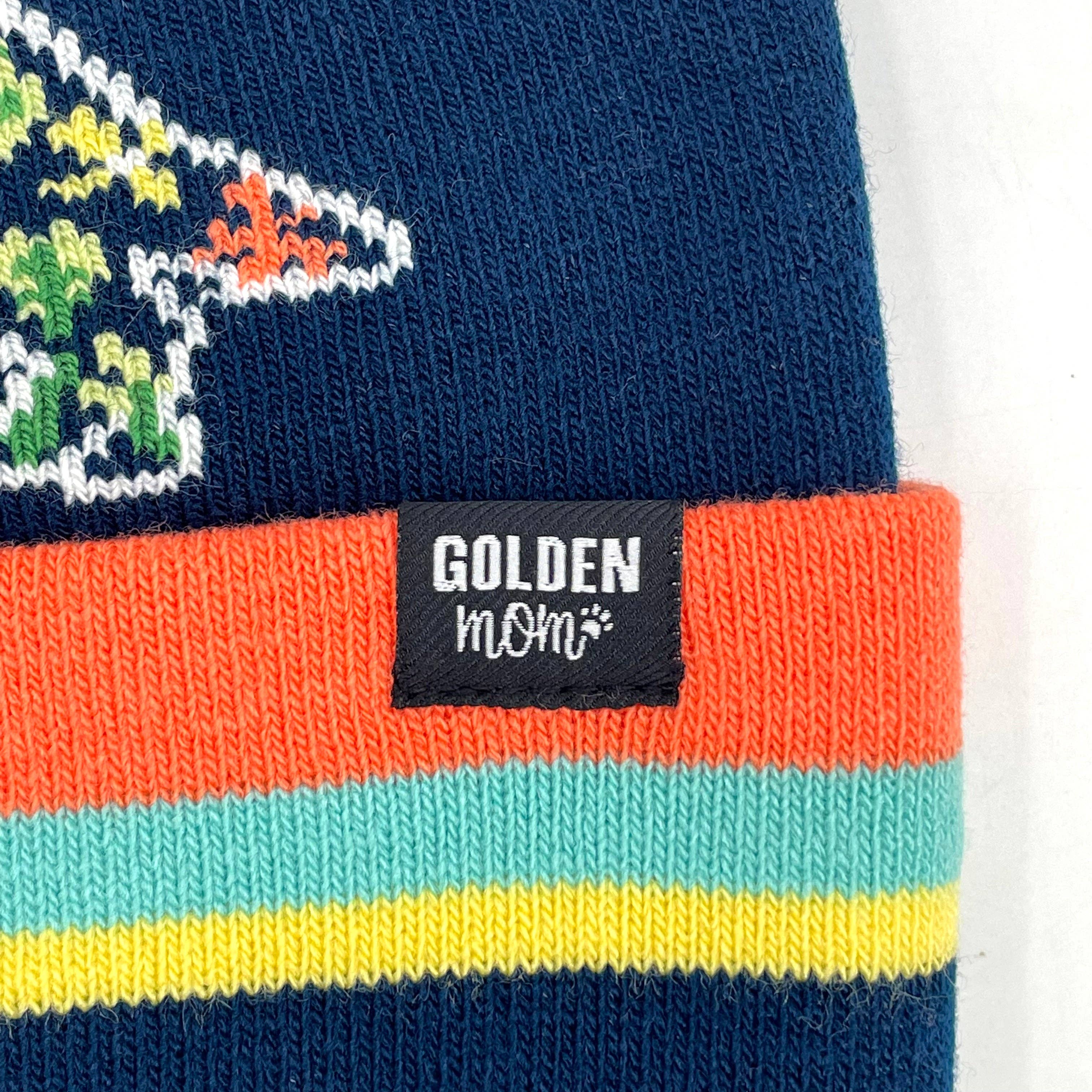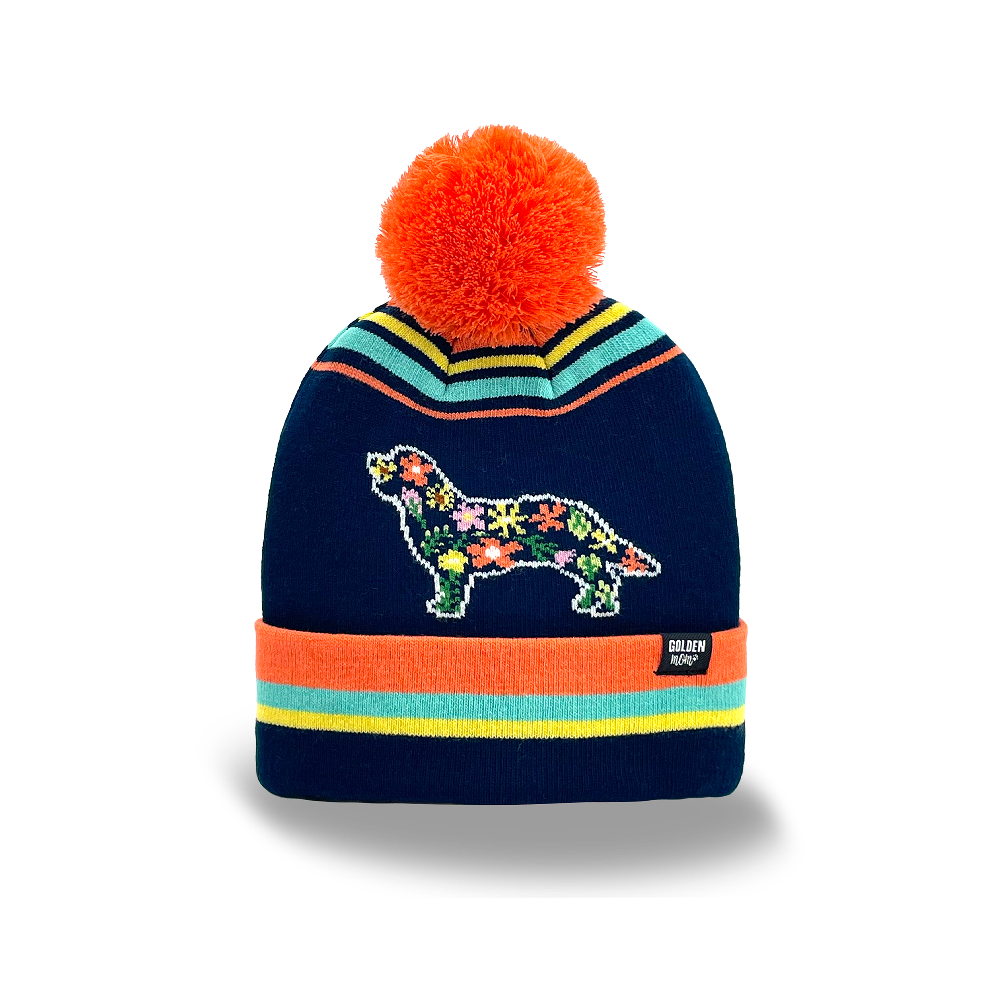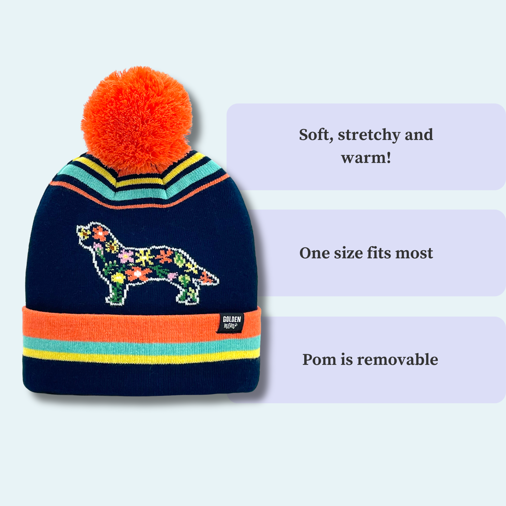 The design features a joyful Golden Retriever silhouette filled with colorful floral patterns, set against a deep navy knit background. A bold striped cuff in orange, teal, and yellow adds playful contrast, while the fluffy orange pom pom on top brings a fun, winter-ready finish.