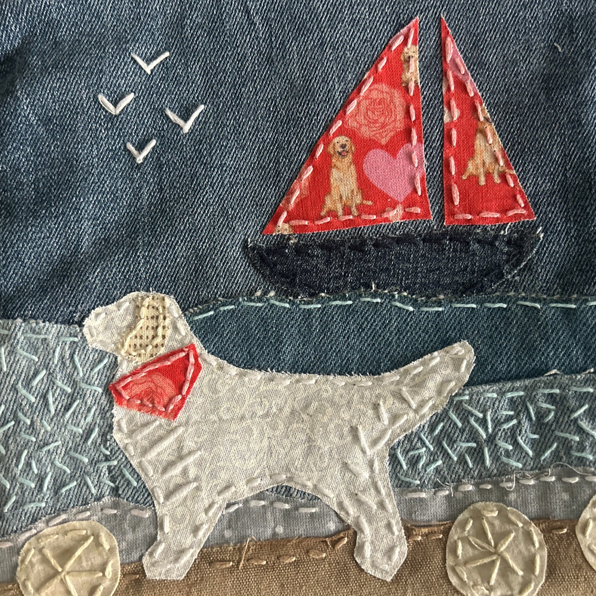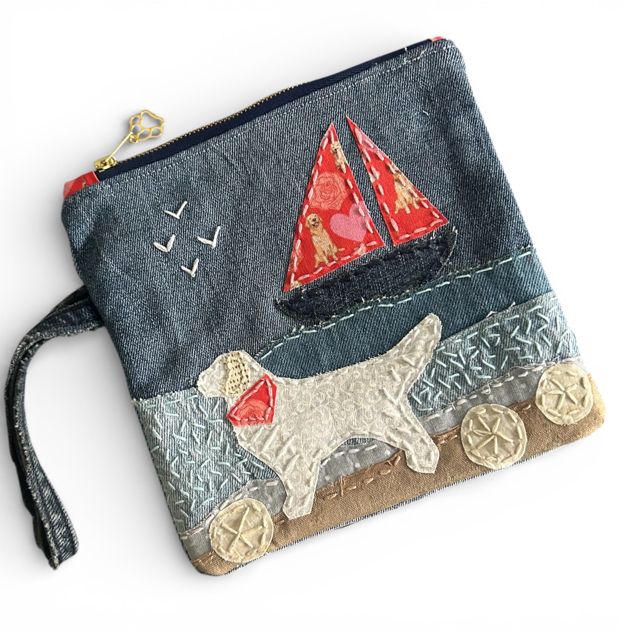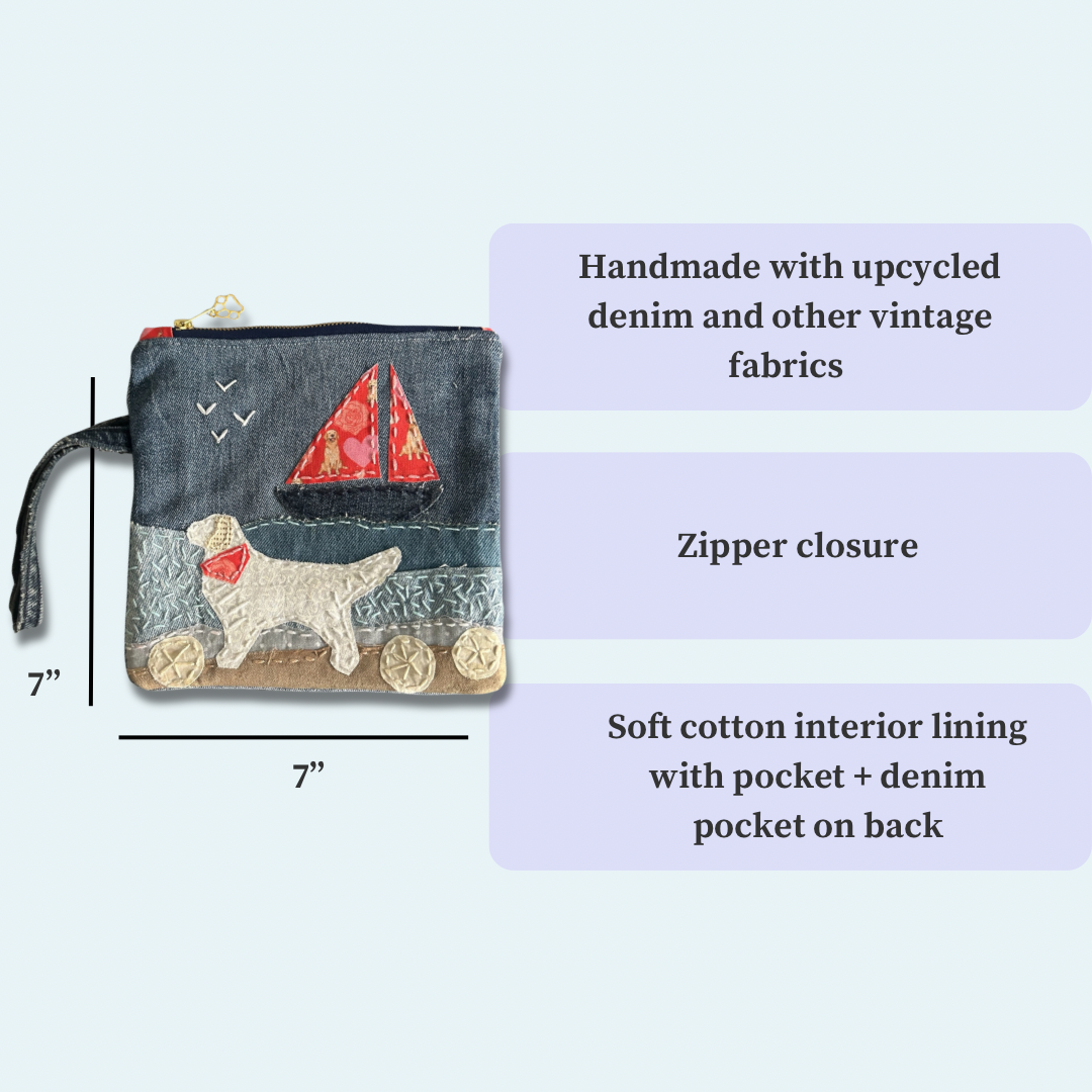 At the heart of the coastal design is a hand-stitched Golden Retriever motif, created using traditional slow-stitch embroidery techniques. Each stitch is intentionally placed, celebrating craftsmanship, texture, and the beauty of re-used materials. Layered fabrics, visible hand stitching, and thoughtful details give this pouch a cozy, story-rich feel you simply won’t find in mass-produced accessories.