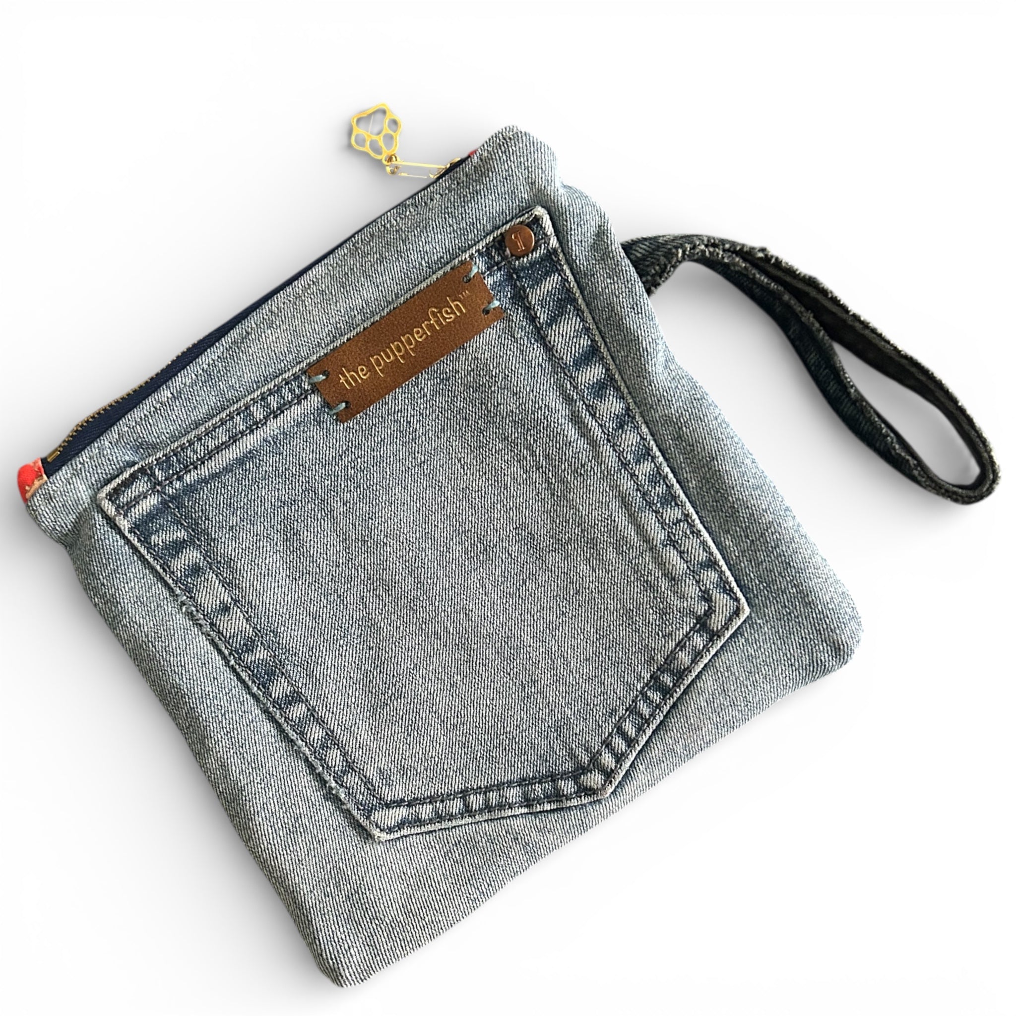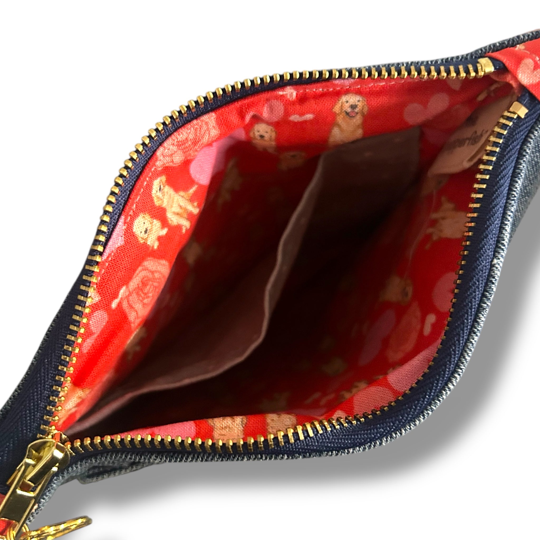 This one-of-a-kind Golden Retriever wristlet pouch is lovingly handmade using upcycled denim and a curated mix of recycled and vintage fabrics- no two are ever exactly alike.