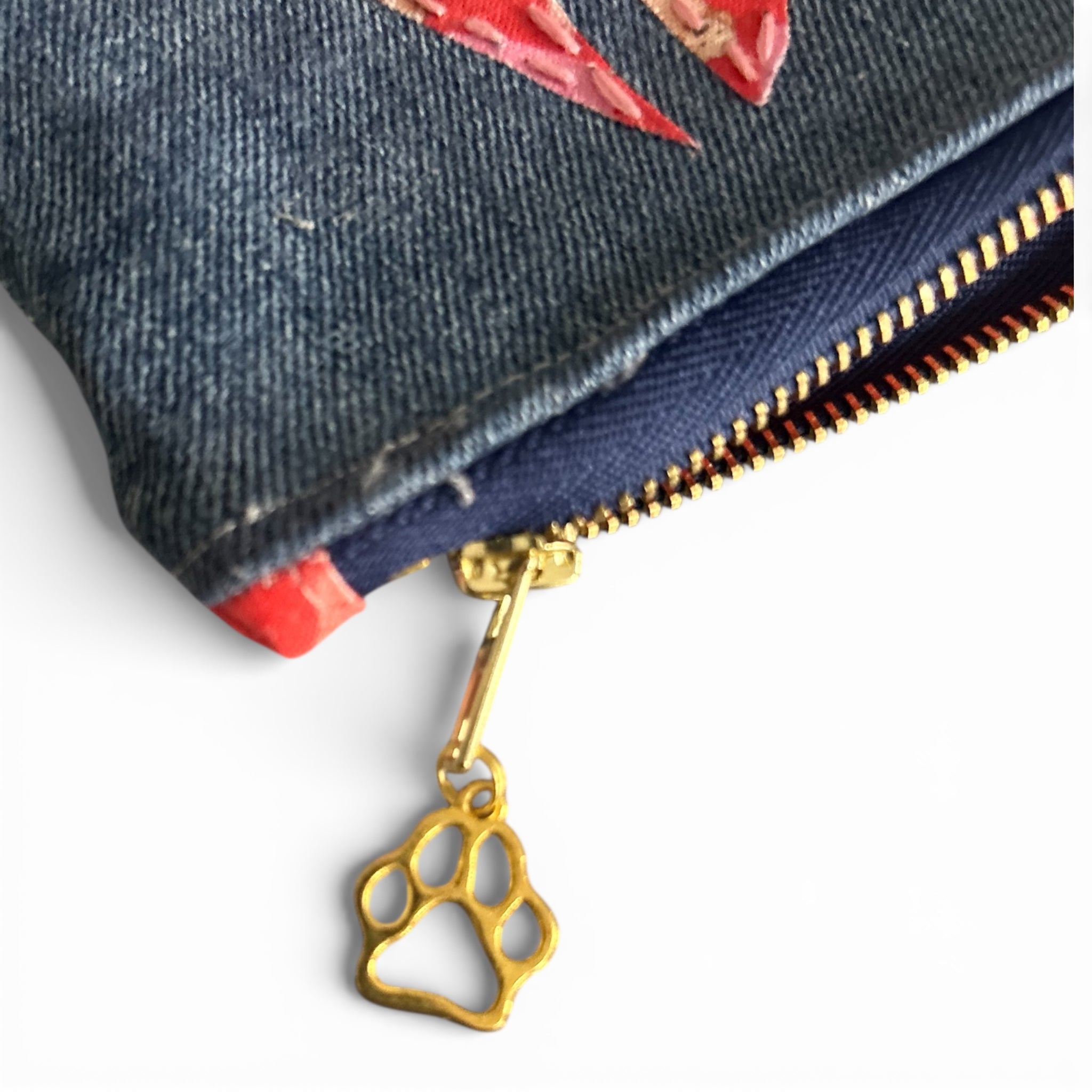 Finished with a secure zipper closure, wrist strap for easy carrying, interior pocket, and a signature paw-print zipper pull, this pouch blends function, sustainability, and heartfelt design.