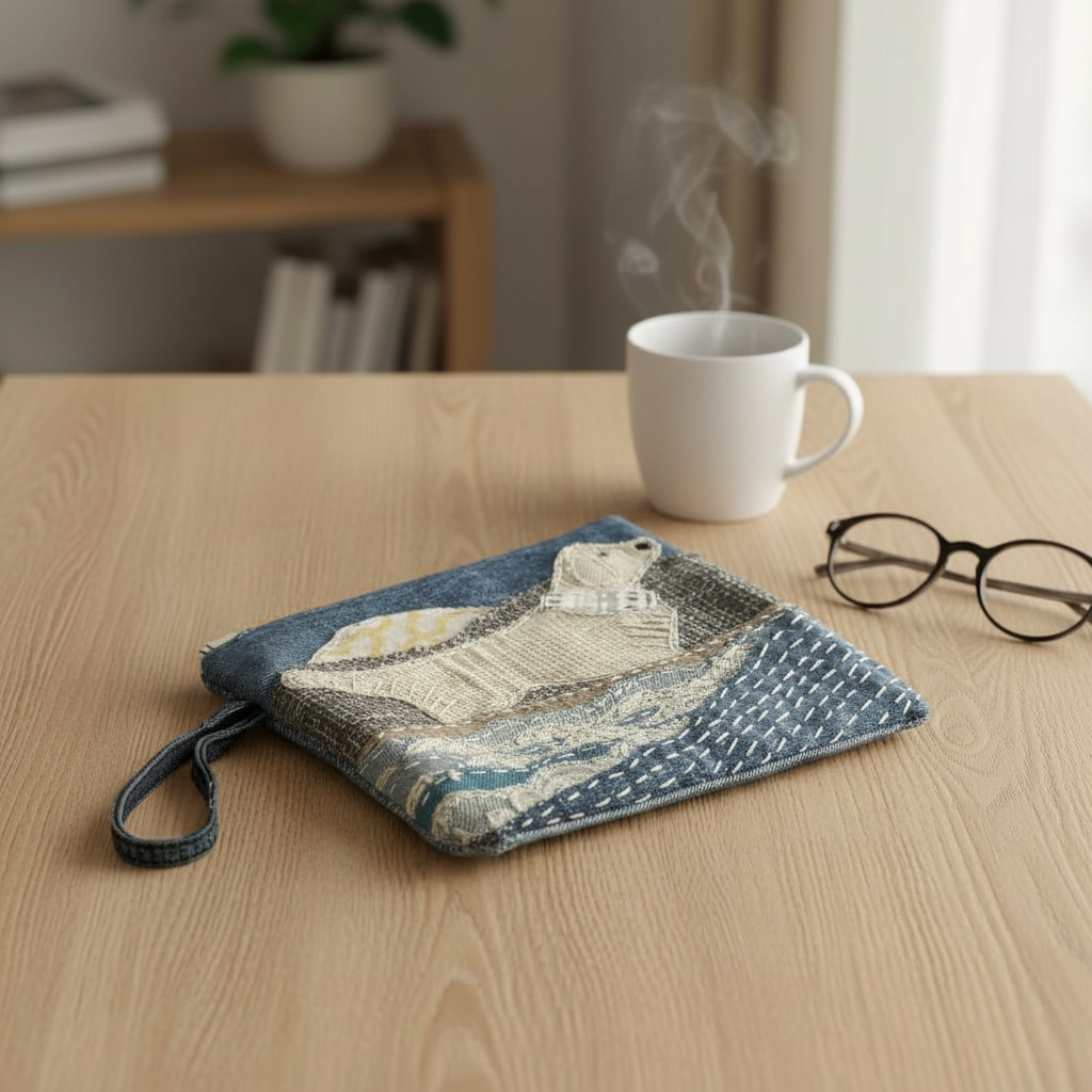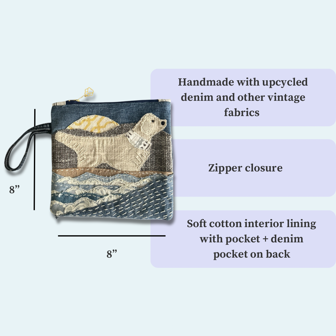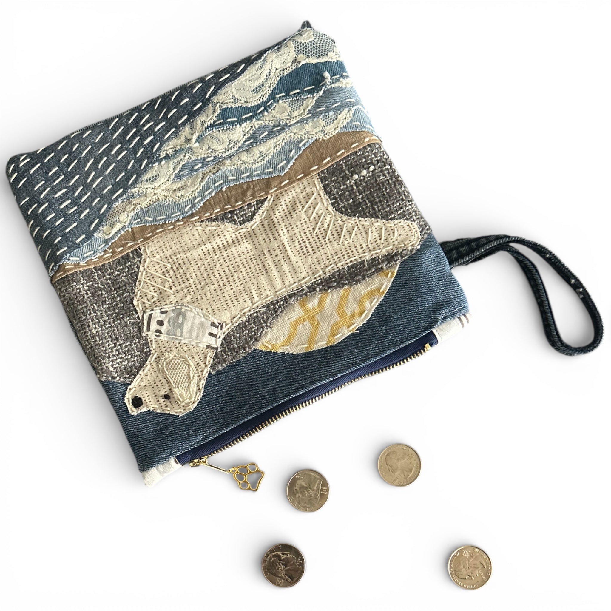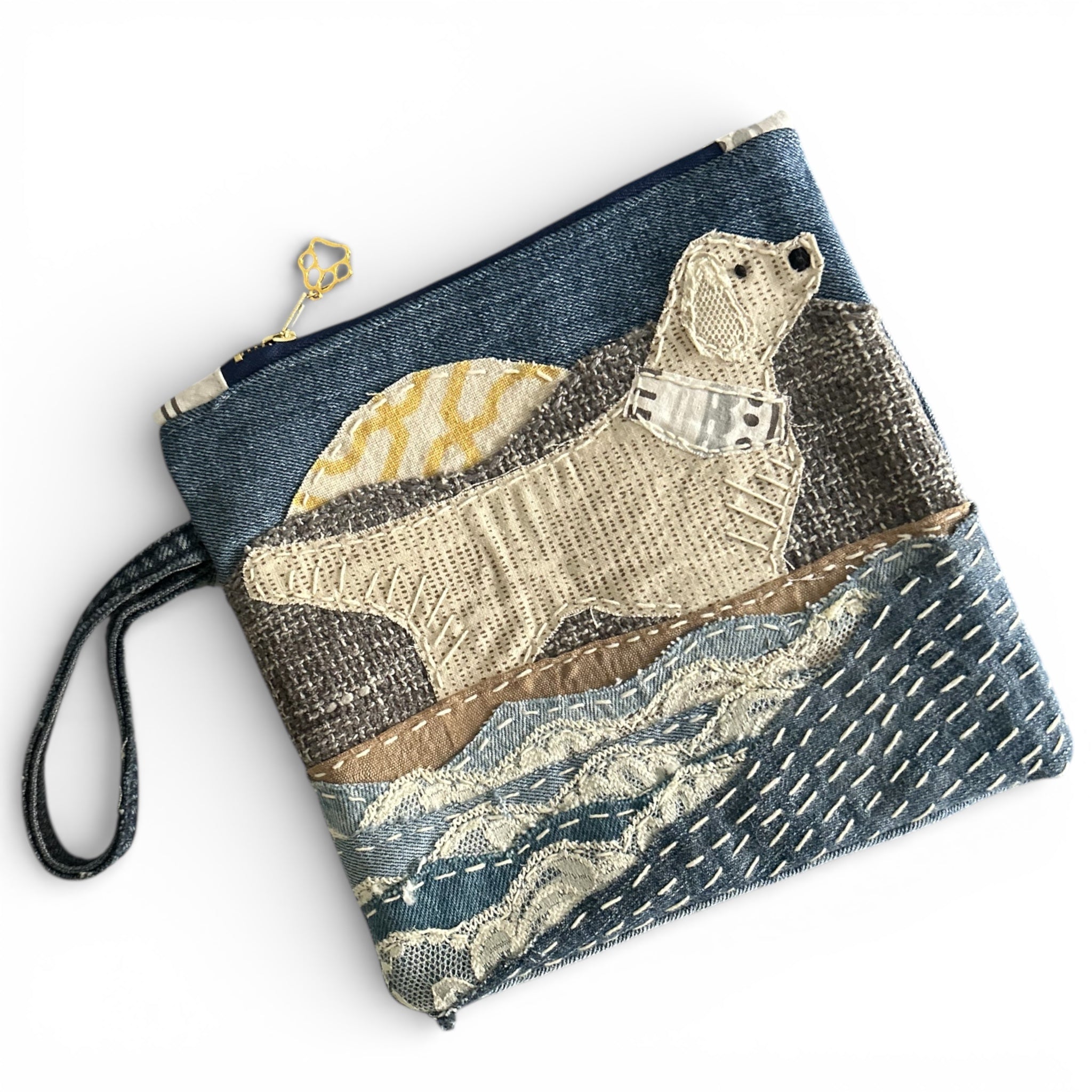 This hand-stitched Golden Retriever denim wristlet pouch is a calm, earthy take on wearable textile art, thoughtfully made from upcycled denim and a curated mix of recycled and vintage fabrics. Designed and stitched slowly by hand, this piece celebrates texture, neutrality, and intentional craftsmanship.