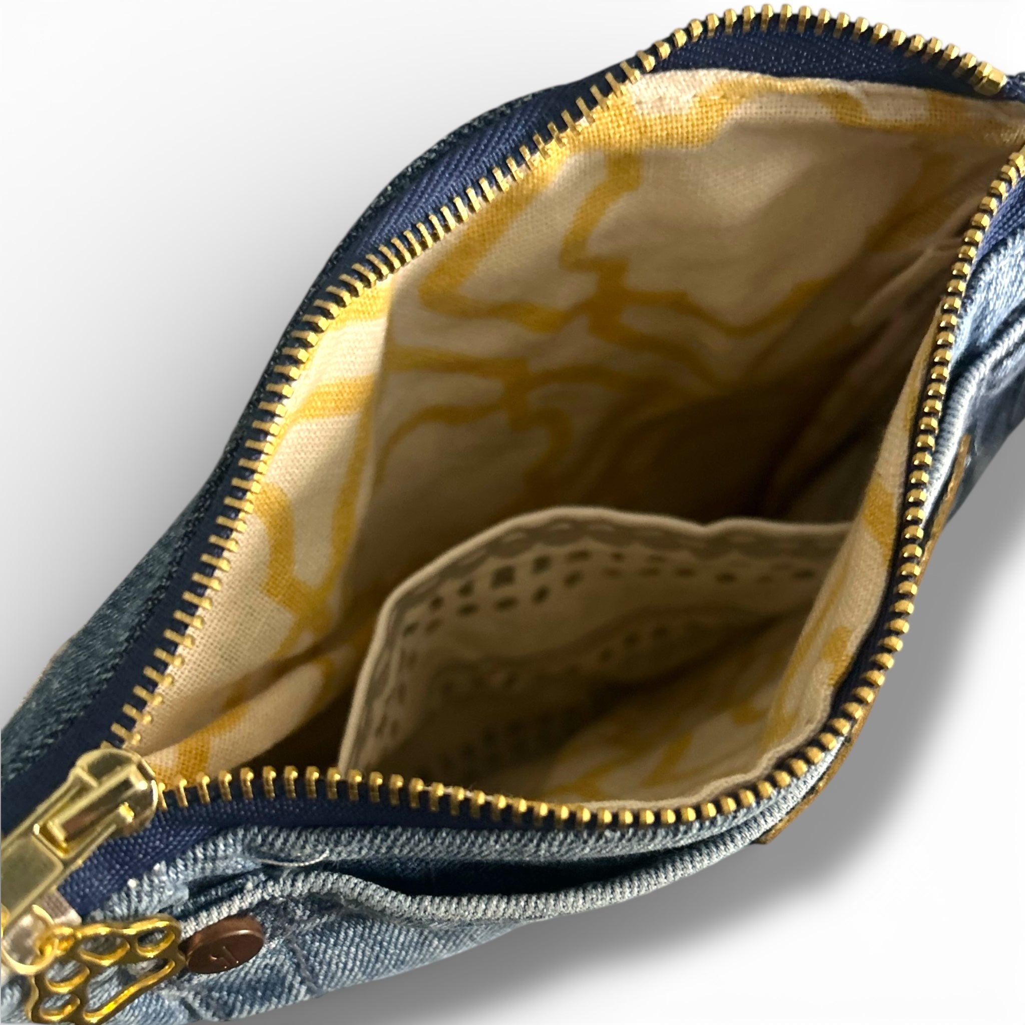 8”x8” pouch made from rescued denim and a mix of recycled and vintage fabrics.