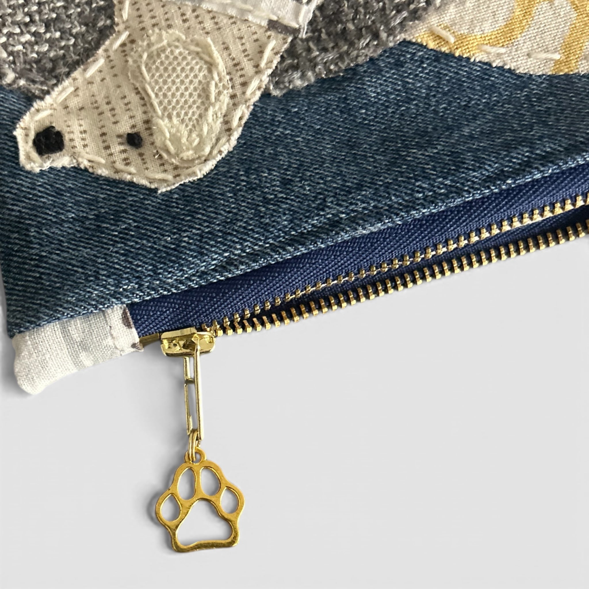 Finished with a gold-tone zipper, paw-print zipper pull, and denim wrist strap, this pouch balances beauty and function. The back showcases a repurposed denim pocket- a reminder that this piece once lived another life before becoming something new.