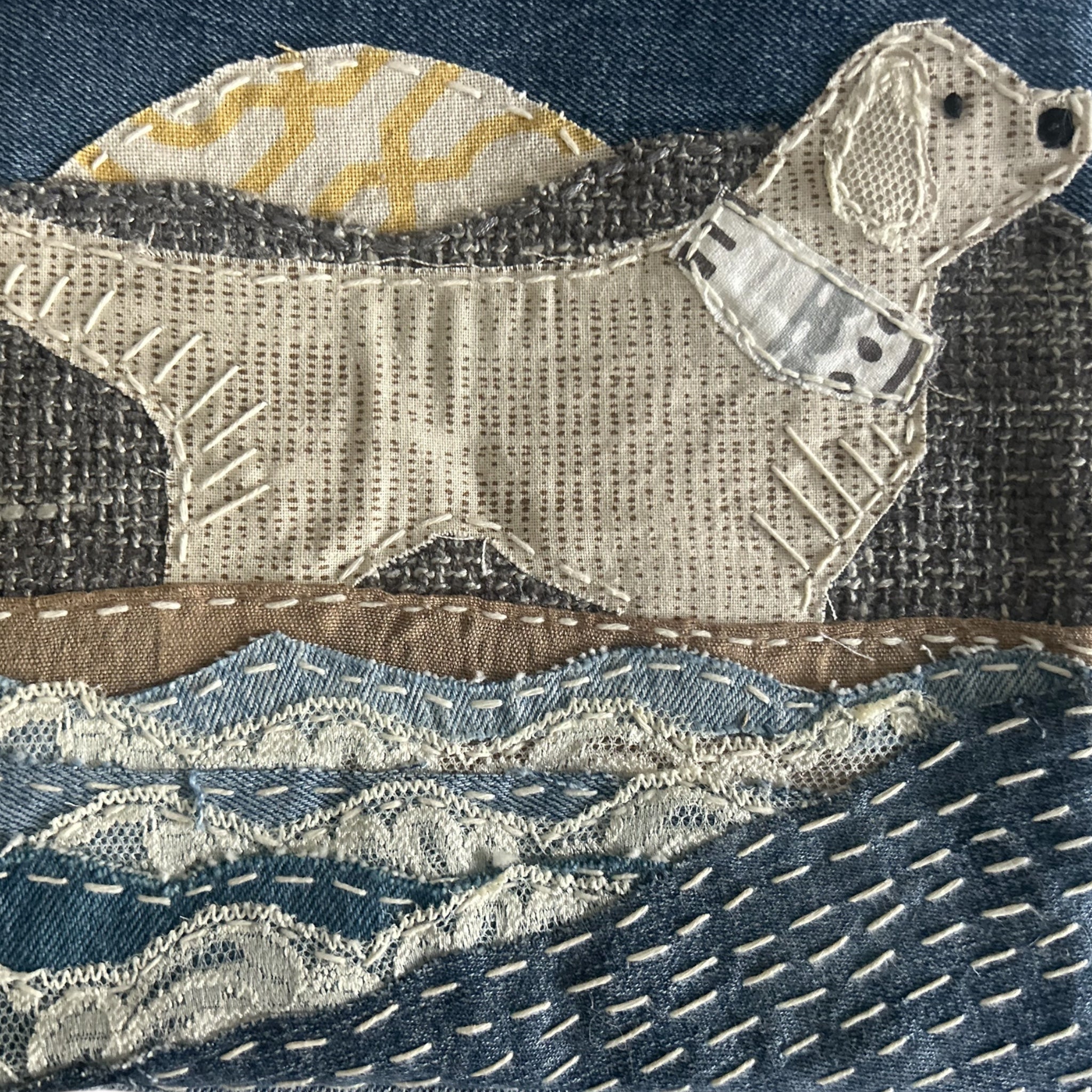 The front features a Golden Retriever silhouette, hand-appliquéd in soft, neutral fabrics and outlined with visible slow-stitch embroidery. Layered textiles create a subtle landscape effect beneath the golden, while hand-sewn running stitches add depth and movement throughout the design. A softly patterned fabric peeks through the background, adding warmth without overpowering the palette.