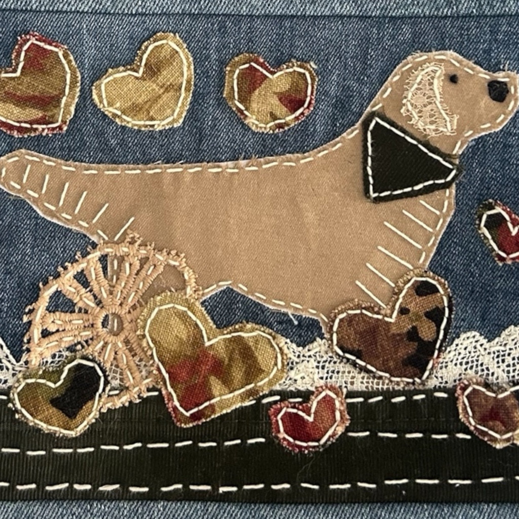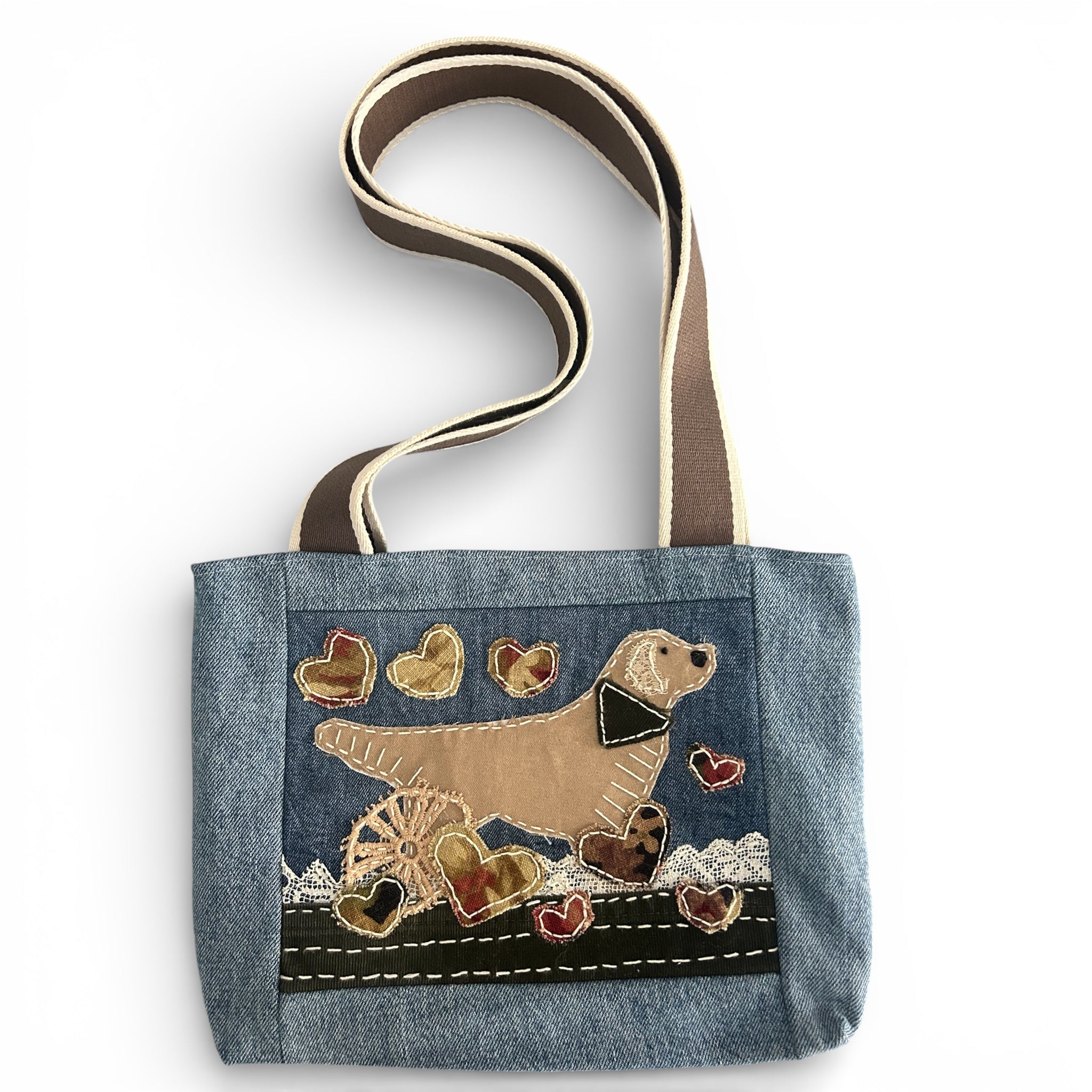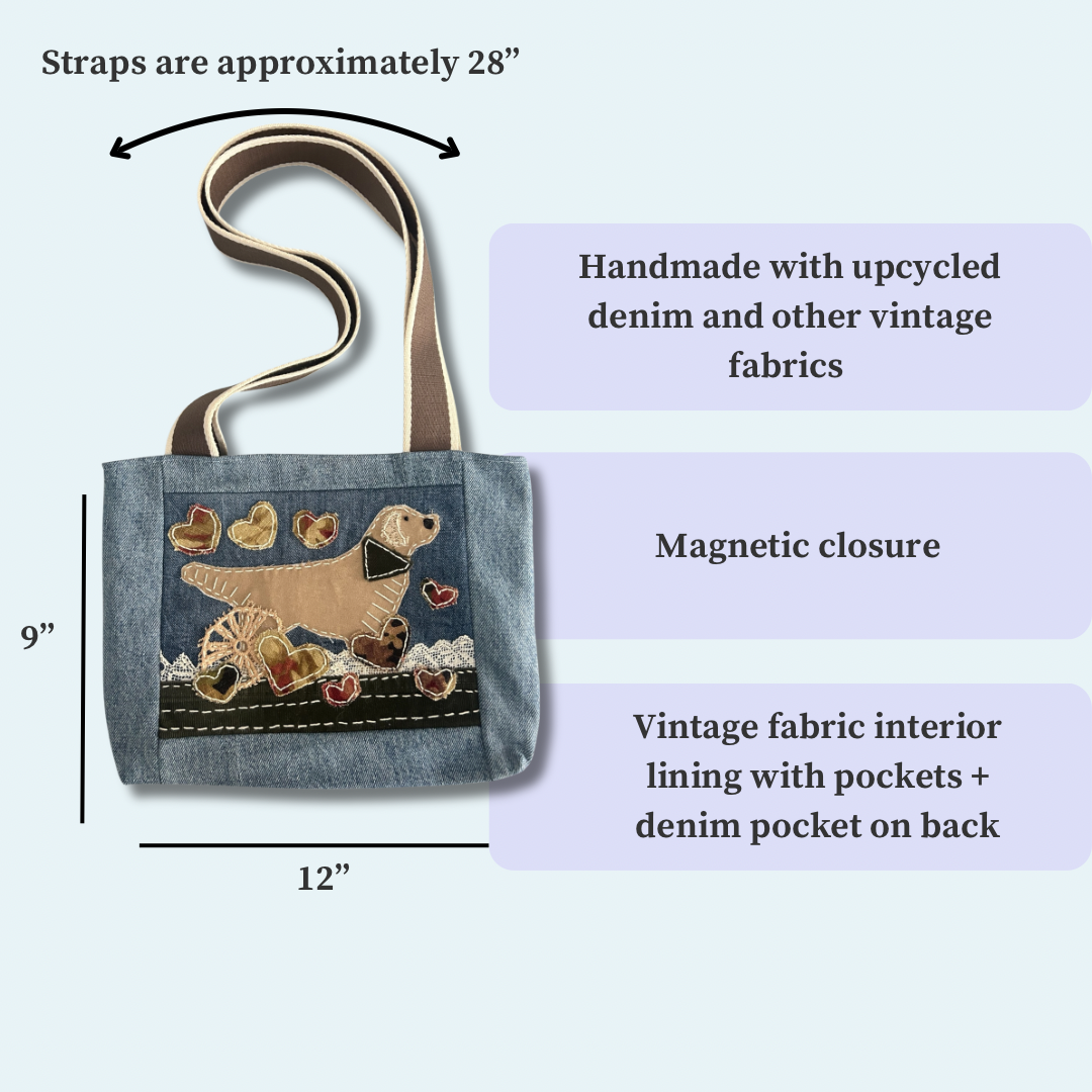 This handmade denim tote bag features a Golden Retriever appliqué, carefully stitched by hand using upcycled and vintage fabrics.