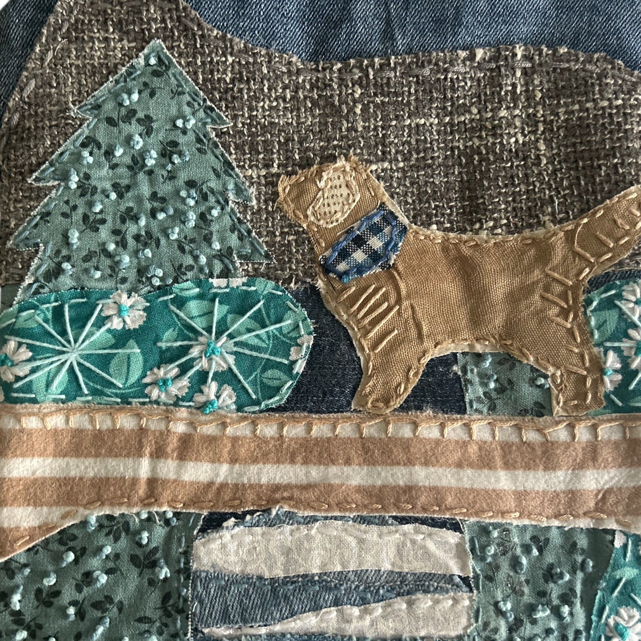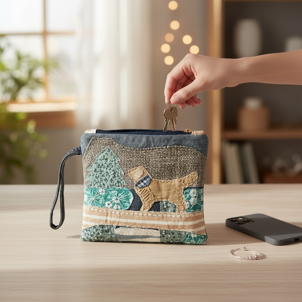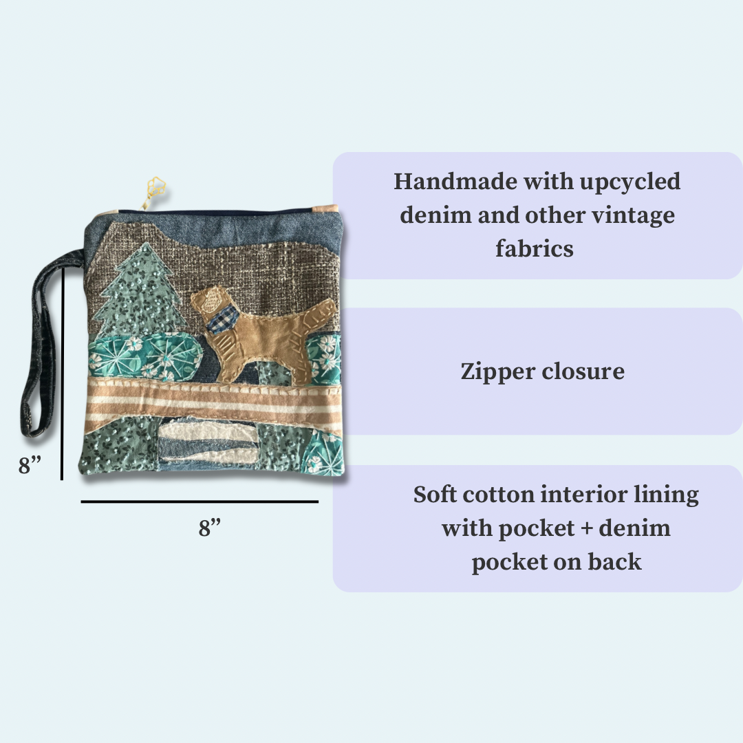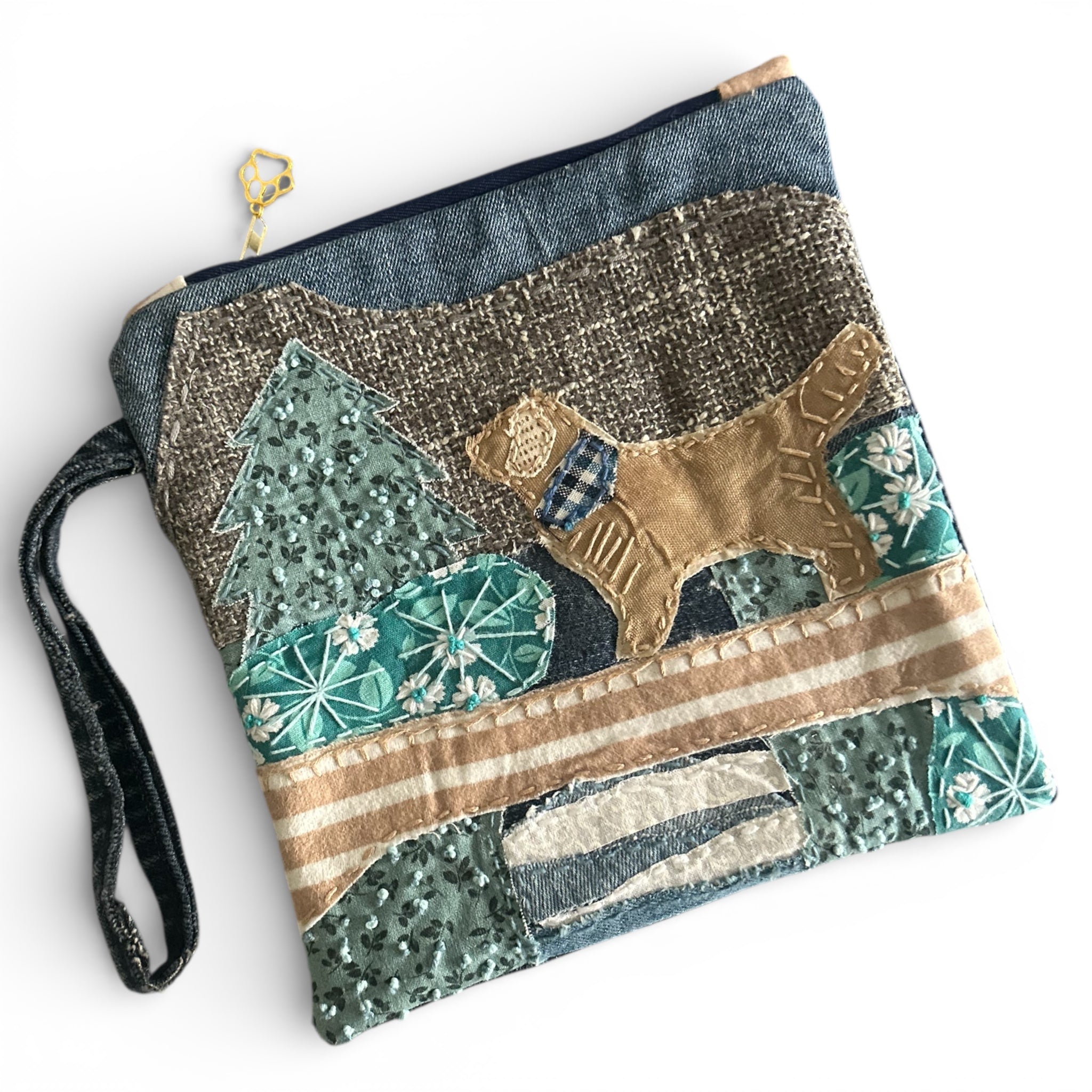 This hand-stitched Golden Retriever denim wristlet pouch captures a quiet woodland moment- a golden retriever mid-stride, surrounded by trees, textured hills, and winding paths. Thoughtfully made from upcycled denim and a mix of recycled and vintage fabrics, this one-of-a-kind piece blends storytelling with slow, intentional craftsmanship.
