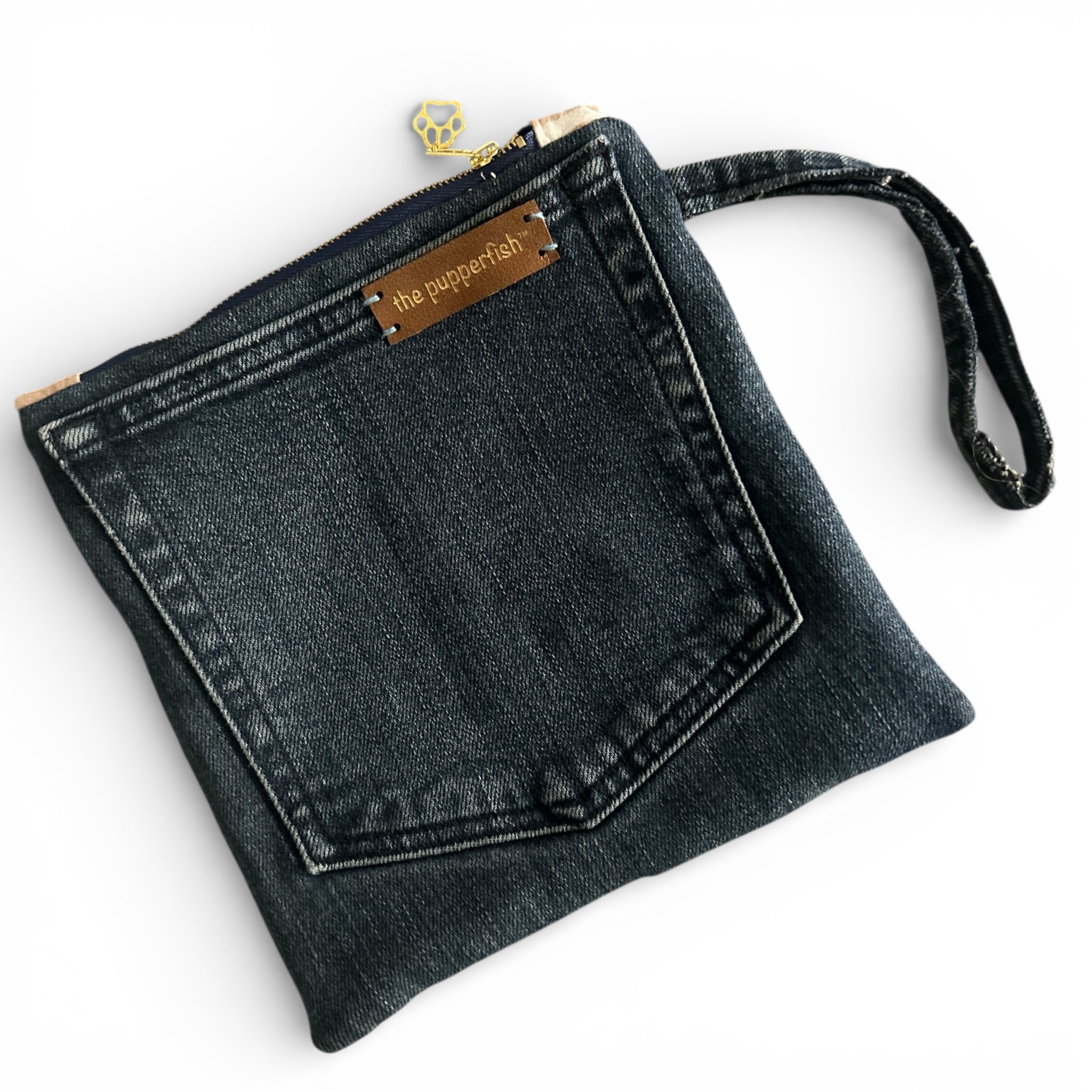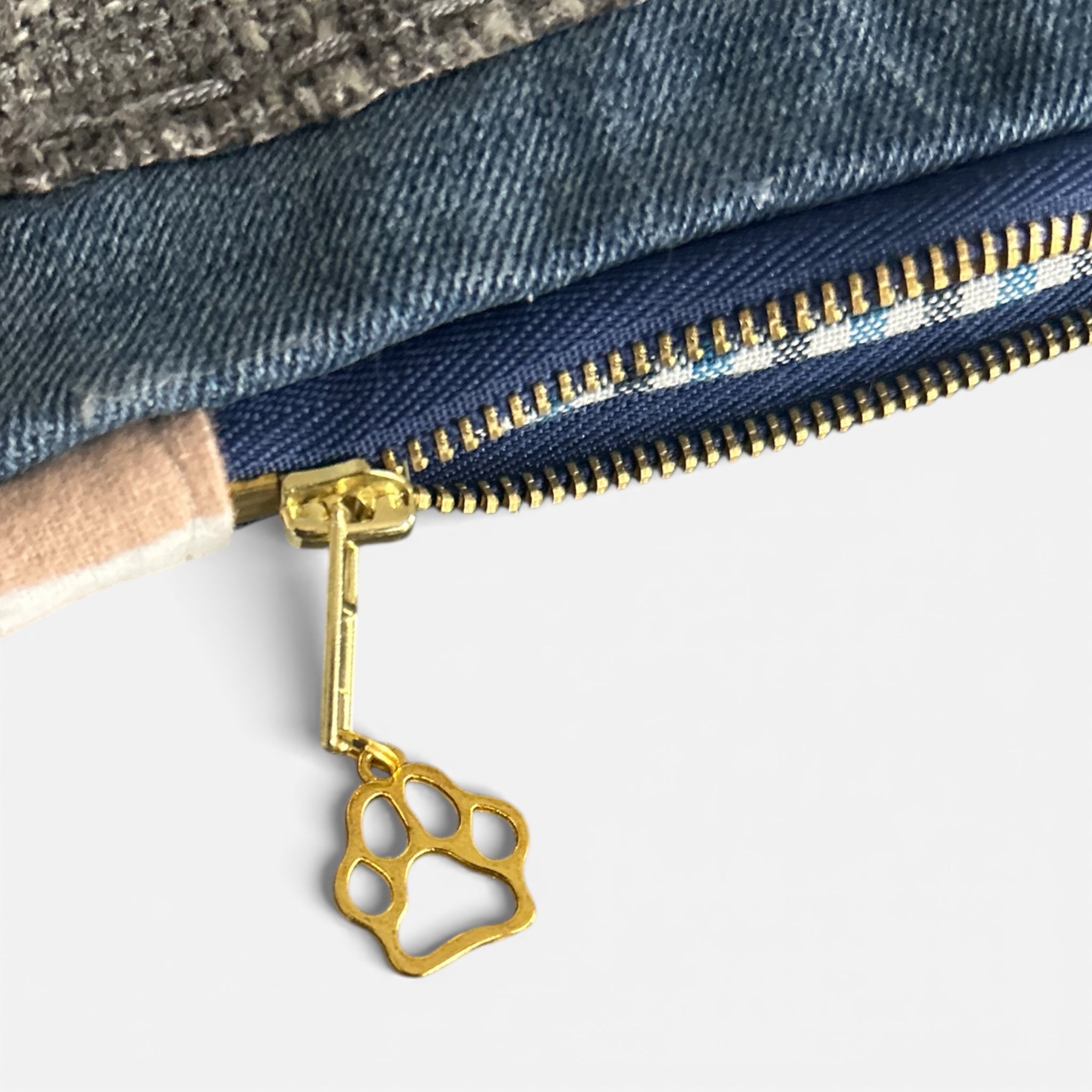 A gold-tone zipper with a paw-print pull, durable denim wrist strap, and structured silhouette make this pouch as functional as it is meaningful. Flip it over to reveal a repurposed denim pocket- a signature reminder that this piece was lovingly reimagined from reclaimed materials.