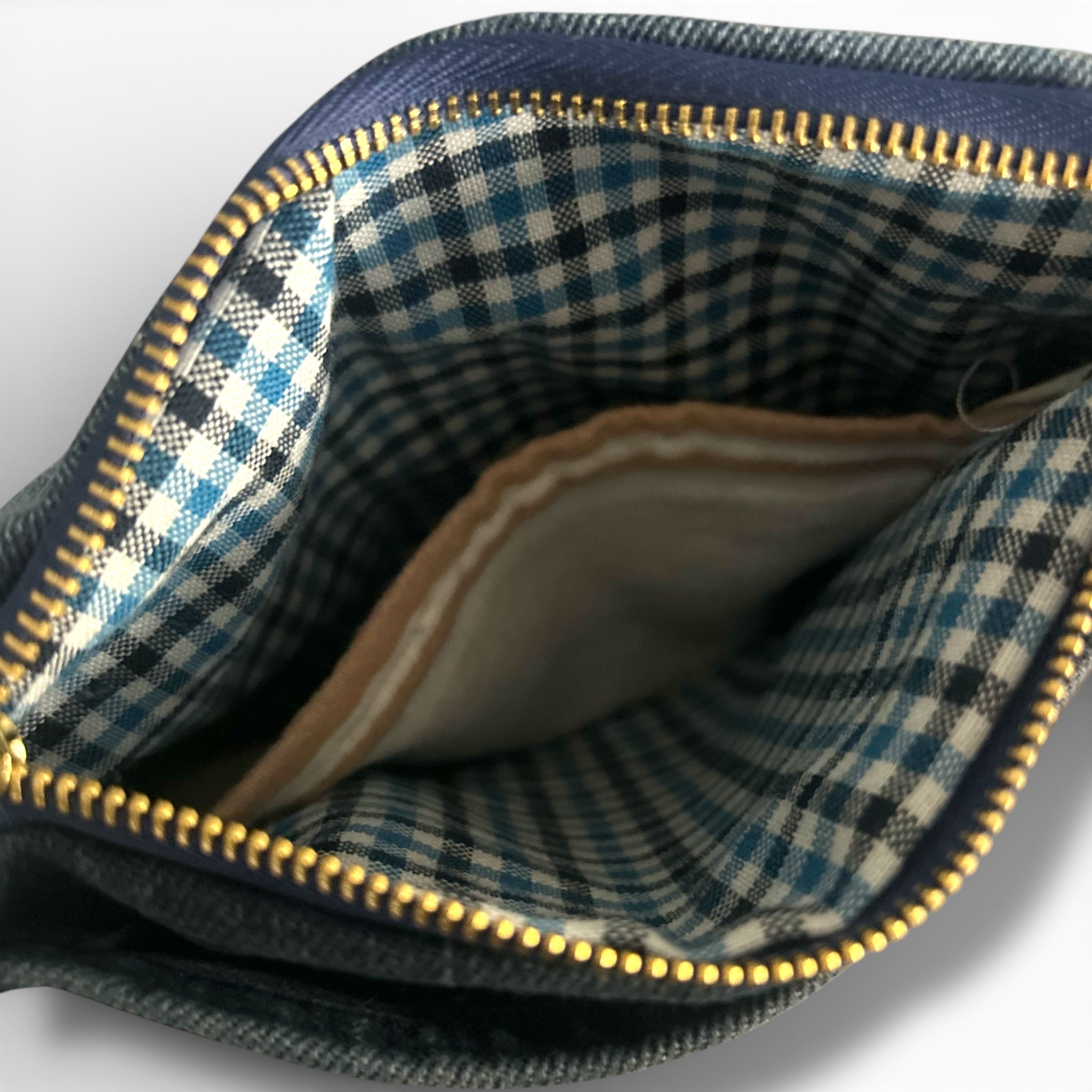 8” x 8” pouch from upcycled denim and a curated mix of recycled and vintage fabrics.
